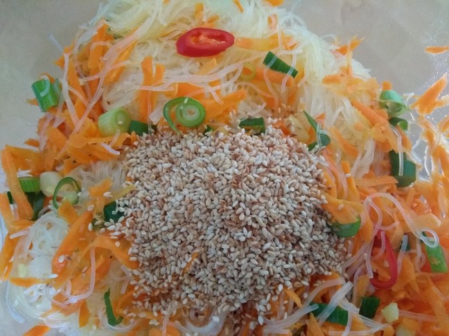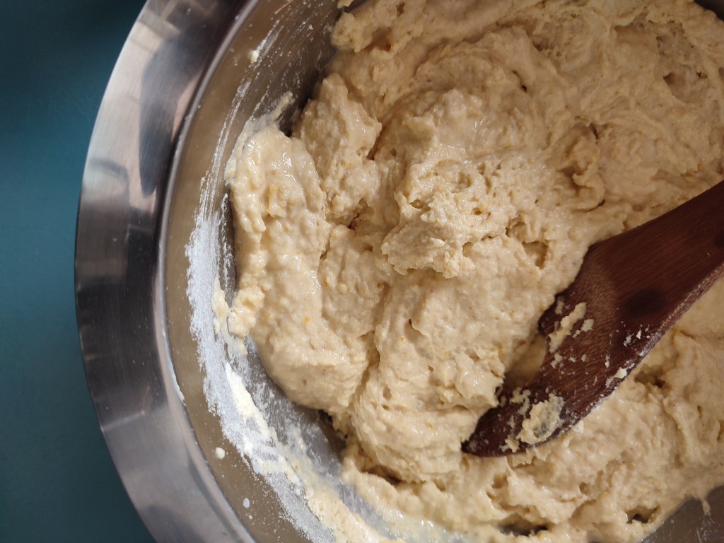 Die trockenen Zutaten in einer Schüssel mischen, mit dem Sojadrink/Essiggemisch zu einem Teig verrühren, geht prima mit einem Kochlöffel.