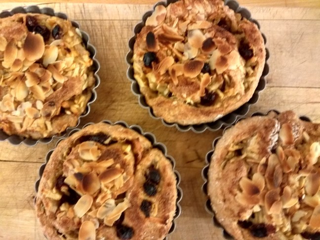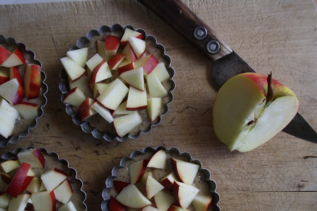 Die Äpfel vierteln und in kleine Schnitzchen schneiden. Auf die Förmchen verteilen. Mit Zimt und Zucker bestreuen und bei 175 C auf mittlerer Schiene 10 bis 15 Minuten backen.